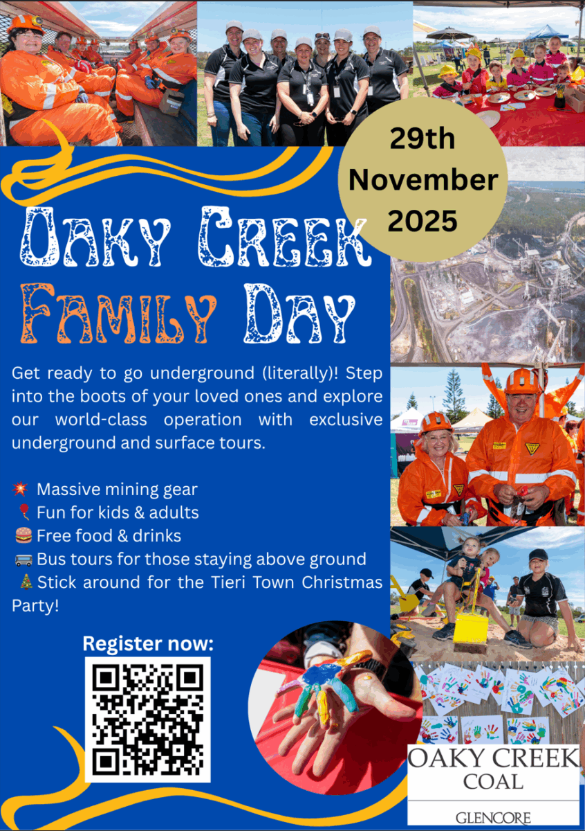You’re invited to the Oaky Creek Family Day on Saturday 29 November 2025! Join us for an unforgettable experience where you can see first-hand what life is like underground. Explore our world-class mining operation with exclusive underground and surface tours, check out massive mining gear, and enjoy a day packed with fun for the whole family. With free food and drinks, kids’ activities, above-ground bus tours. Registrations close 28 September 2025.