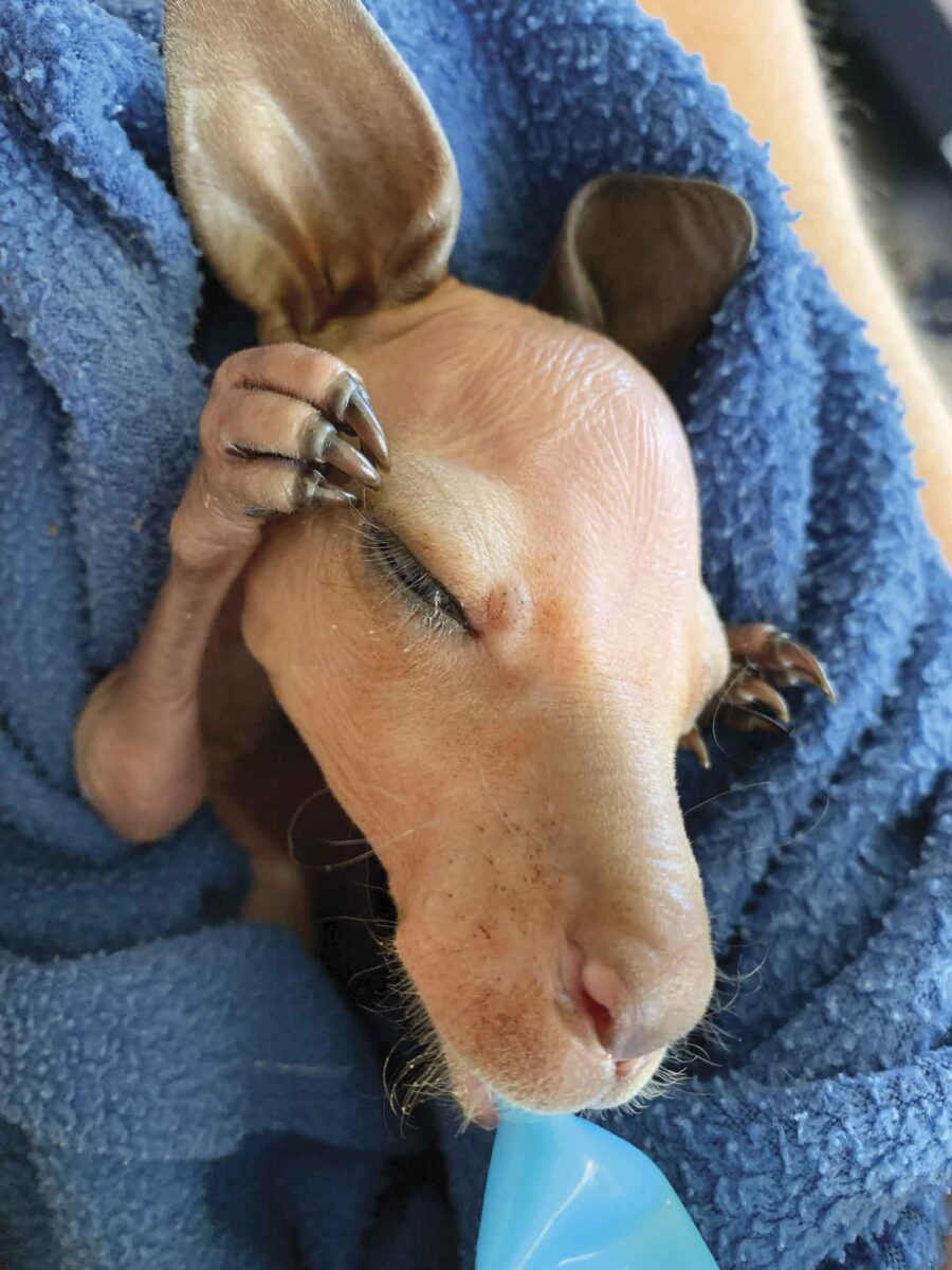 I’ll bring the injured or distressed animal back to the house and that’s when the care begins. I’ll weigh them, check for injuries, determine whether there are any broken bones and what the immediate need is, administer medical attention, warm them up, and then feed them as quickly as possible so that they’re hydrating. Dehydration can actually be the biggest cause of loss so it’s important we get fluids into them as soon as possible and keep that up. The feeding regime can be 4-hourly, throughout day and night so it’s pretty intensive, especially when we have multiple animals in our care. Surprisingly though, it gets easier the more you have as you get into a bit of a routine.